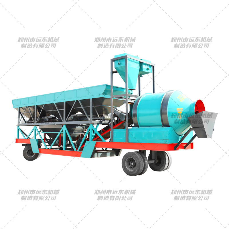 移動攪拌站,是一種可移動的混凝土攪拌站設備。通過設計,把攪拌站的配料系統、稱量系統、攪拌主機、儲料、卸料以及自動控制系統集中在一個拖掛單元,通過拖車實現攪拌站的移動。攪拌主機減速機、計量傳感器、和控制系統的主要電氣元件均采用進口元件,不僅大大地降低了設備的故障率,而且提高了設備的計量精度。整機采用計算機控制,既可自動也可手動操作,操作簡單,易于掌握。動態面板顯示,能清楚了解各部件的運行情況,同時可以存儲、打印報表資料,為生產調度管理提供了方便。 1、滾筒移動攪拌站外部設有骨料配料裝置及輸送砂、石骨料用的皮帶輸送機。 2、骨料儲料上架設皮帶輸送機的機頭和支架,骨料預加料斗(儲存已混合、稱量好的骨料)。它們將按配比稱量好的骨料傳送裝置卸料到混凝土攪拌機內。 3、攪拌機平臺上裝有臺滾筒攪拌機,在其上部是計量裝置,按配比分別稱量水泥、水、塑化劑等的用量,待稱量完畢后,卸入攪拌機內,連同稱量好的骨料進行攪拌,攪拌均勻的混凝土可以卸料到混凝土運輸車中運走。